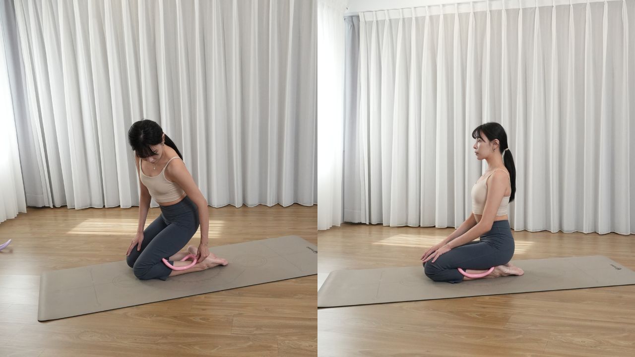 從跪姿進入,將瑜珈環墊在大小腿之間後,臀部慢慢向下壓。運用臀部重量,讓瑜珈環來刺激我們的深層的比目魚肌,讓小腿肌肉達到釋放壓力。