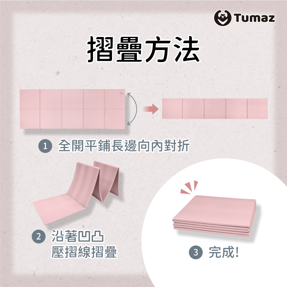 沿著墊子本身凹凸壓摺線收納,將背面摺疊朝外、正面摺疊朝內