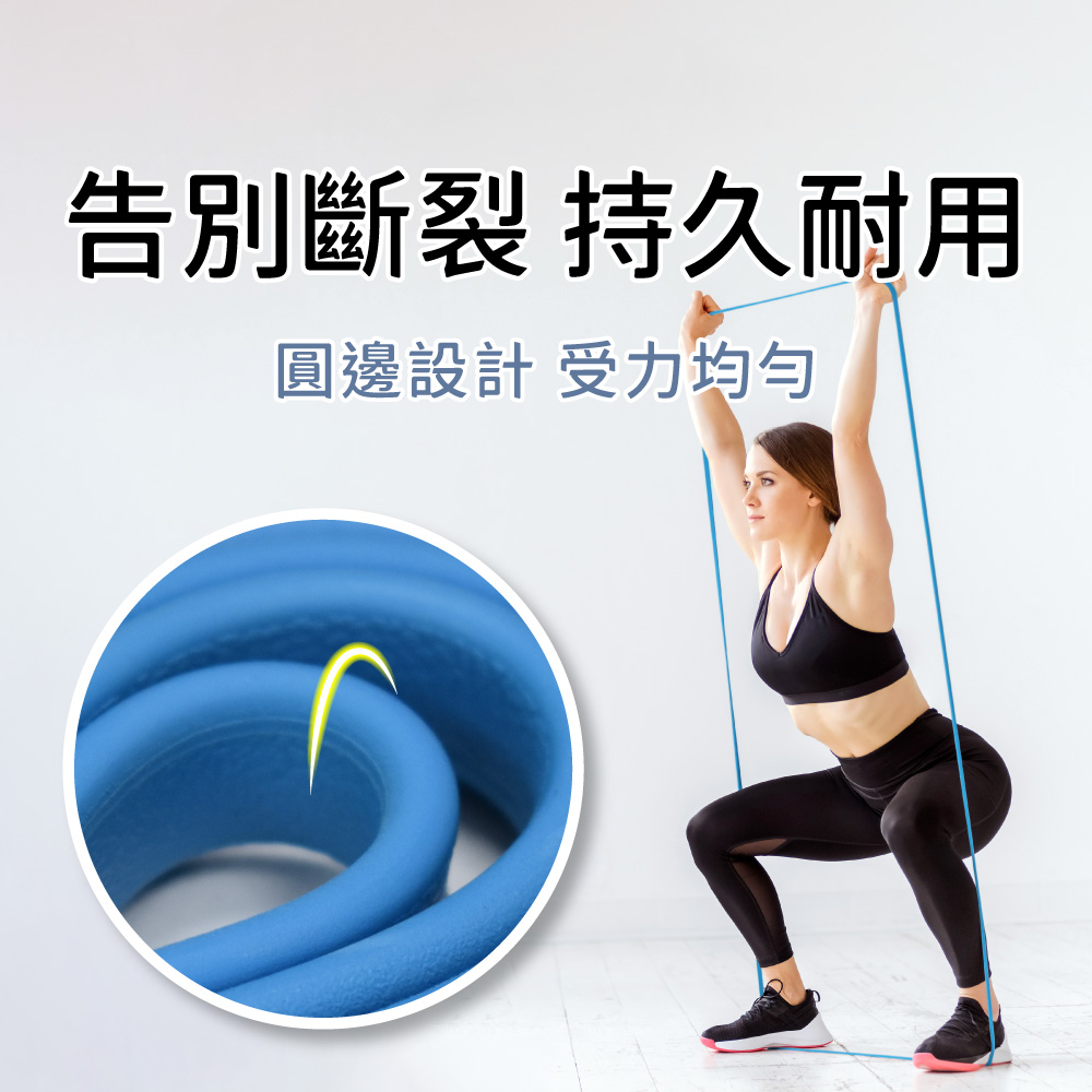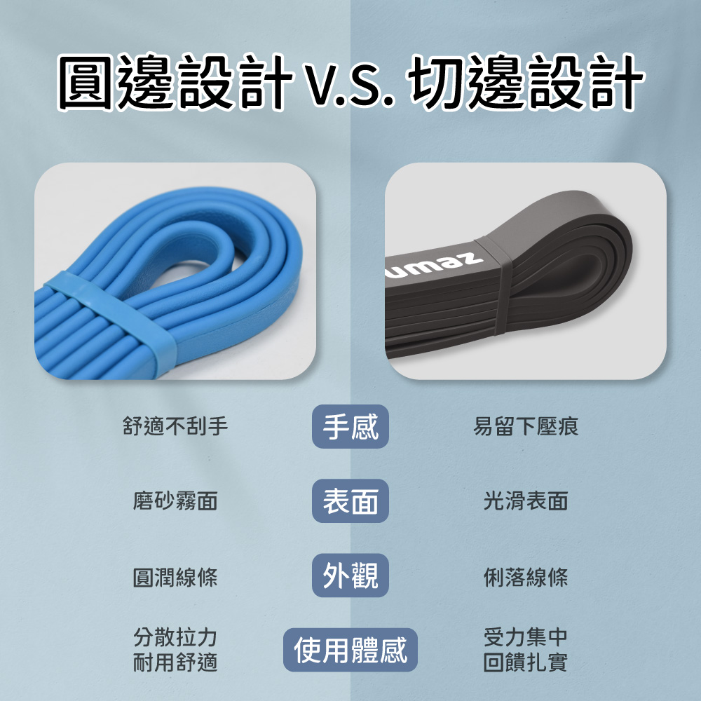 傳統彈力繩直角切邊容易刮手、壓痕,甚至拉伸後翹邊變形。這款改良為圓角加厚設計,觸感柔順不傷膚,同時分散拉力集中點,耐拉不斷裂。選用高純度天然乳膠,具優秀回彈力,即使高頻率使用,也能維持穩定張力與使用壽命。