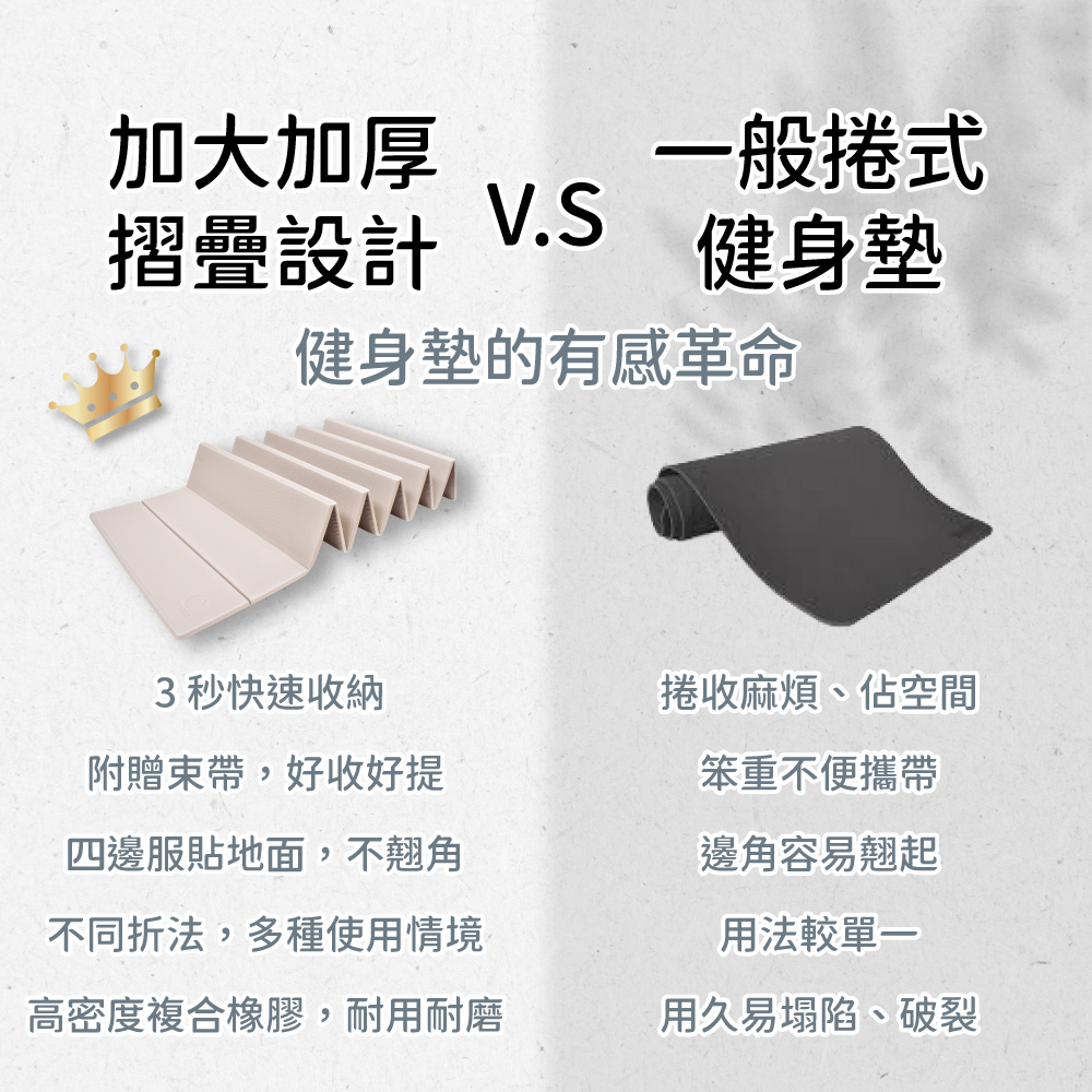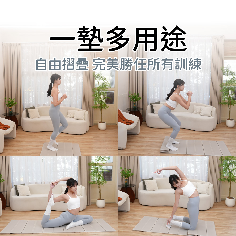 獨家摺疊設計,可根據訓練強度自由切換厚度。對摺後可作為深蹲、核心訓練、超慢跑、健身磚、跪姿訓練的加強緩衝,平鋪則是寬敞的瑜伽空間亦可作為嬰兒爬行墊。一張墊子,勝過六張傳統墊。