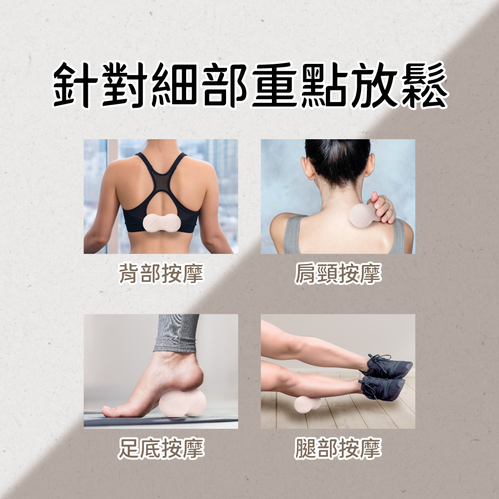 ‧ 靠牆或地板,針對小部位進行滾壓或按壓,如頸椎、背部、手臂、手腕、小腿、大腿、腳底等。