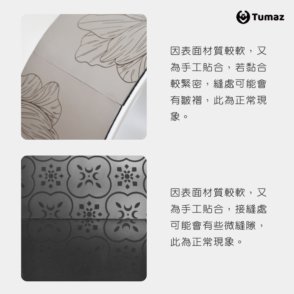 1. 因為表面材質較軟,又為手工貼合,每一個產品接縫處的密合度可能會有落差,可能會緊密貼合或有些微縫隙;若黏合較緊密,接縫處可能會有皺褶,此為正常現象請不介意再購買。